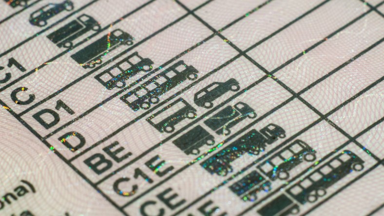 Pokazuje zdjęcie kierowcy, element graficzny z wizerunkiem flagi, hologram.