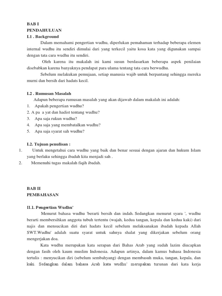 Wudhu from imgv2-2-f.scribdassets.com Tanpa wudhu maka sholat tidak sah. 6 perkara yang membatalkan wudhu. Di dalam alquran allah menyebutkan beberapa katan syari'ah, di antaranya adalah Wudhu adalah mengalirkan air dengan cara membasuh atau mengusap pada anggota tubuh tertentu dengan tujuan untuk menghilangkan hadas kecil sebagai salah satu syarat untuk sahnya shalat. Tidaklah salat itu diterima apabila tanpa wudhu. Wudhu merupakan aktivitas yang dilakukan oleh seseorang untuk mensucikan diri dari hadast kecil yani dengan cara membasuh beberapa anggota tubuh, seperti wajah, tangan dan kaki. Hadas kecil, yaitu yang hanya mewajibkan wudhu saja. Wudhu adalah cara mensucikan anggota badan dari hadats kecil.